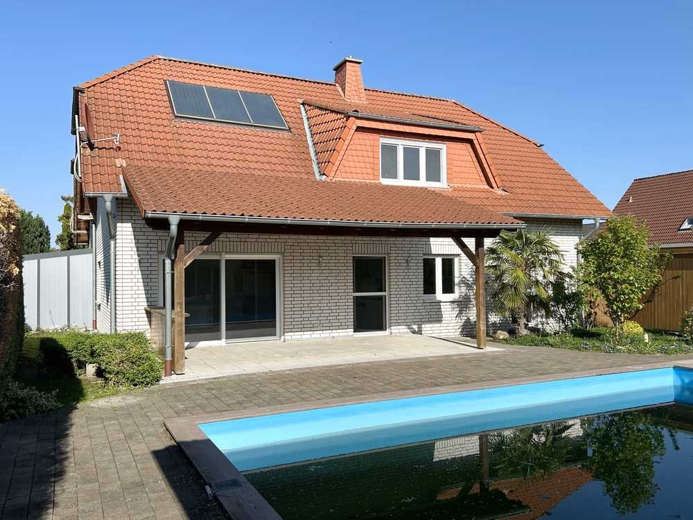 Äußerst gepflegte Immobilie (DHH) mit großer Poolanlage und einem Poolhaus mit Bar. Dieses einmalige Objekt verfügt über einen großzügigen Wohnbereich mit Galerie und offener Küche. Durch die Vollunterkellerung haben Sie hier viele Staumöglichkeiten. Das große Bad mit runder Wanne und ebenerdiger Dusche bieten Komfort auf einem hohen Niveau. Der weitestgehend uneinsehbare Garten ist mit diversen Obstbäumen, Palmen und Sträuchern, im südländischen Stil angelegt. Am Haus steht Ihnen ein Doppel-Carport mit großem Abstellraum und eine Überdachung für das Kaminholz, zur Verfügung.