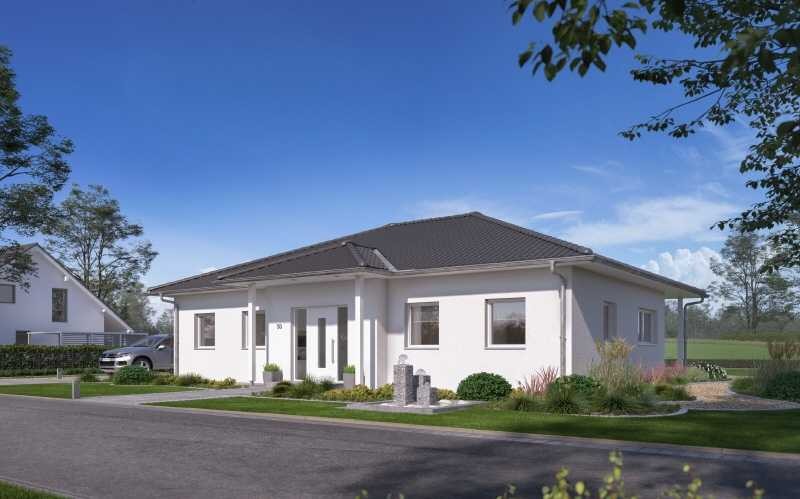 Der offen gestaltete Walmdach-Bungalow Kalea unterteilt sich geschickt auf knapp 130 Quadratmetern Wohnfläche. Schlafzimmer, Gäste- oder Arbeitszimmer, Wohn-/Essbereich, der Hauswirtschaftsraum und die Küche werden durch die Diele verbunden. Entlang der Mittelachse des Bungalows führt der freie Blick on der Haustür direkt in den Garten.