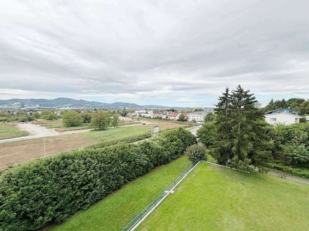 Dem hellen und geräumigen Wohnzimmer schließt sich der Essbereich und die Küche ( Einbauküche ist inklusive ) an. Vom Wohnzimmer gelangen Sie außerdem auf den Balkon, von dem aus Sie den Blick über den Ort und die nahe gelegene Schweiz schweifen lassen können. Er bietet ausreichend Platz um draußen Essen zu können. Die Markise spendet an heißen Tagen Schatten.