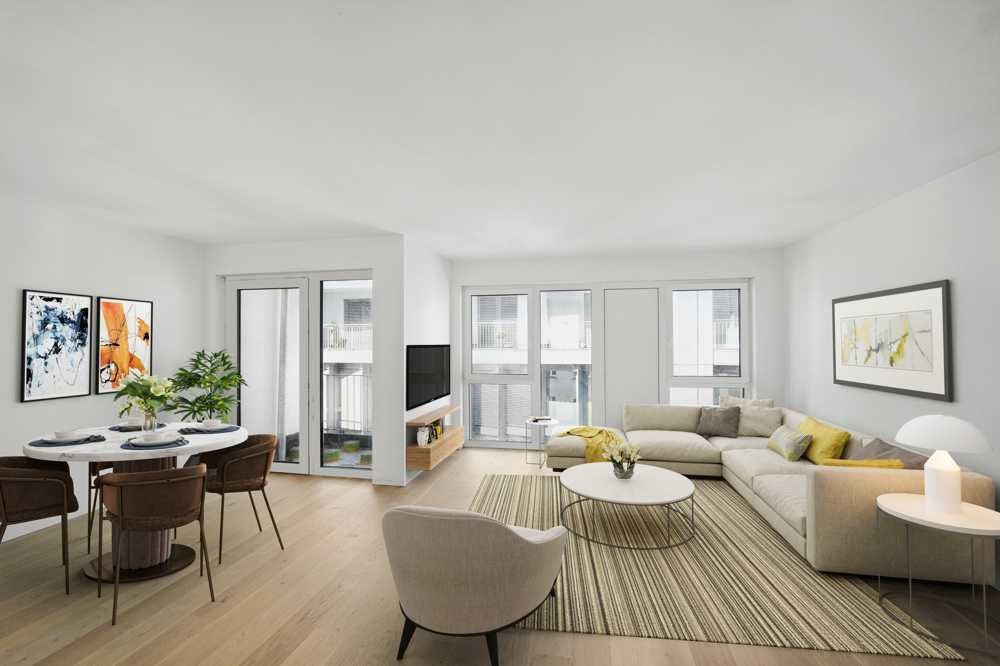 Der Wohn-Essbereich mit offener Küche ist großzügig geschnitten und durch bodentiefe Fenster besonders lichtdurchflutet. Von hier aus gelangen Sie auf den überdachten Balkon, der zu jeder Tageszeit ein schöner Ort zum Verweilen ist.