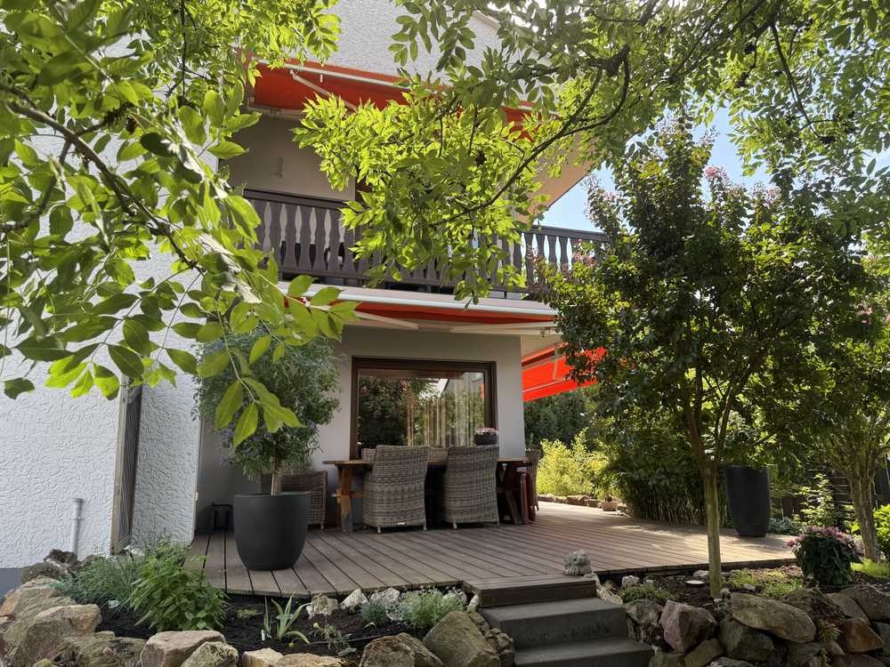 Der Balkon ist von der Küche und dem Wohnzimmer aus begehbar und mit einer Markise ausgestattet. Der Blick in den Garten ist schön und entspannend.