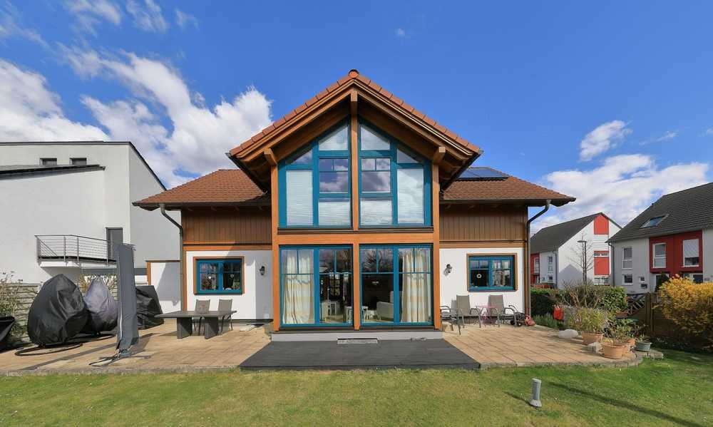 Willkommen in Ihrem neuen Zuhause! Dieses freistehende Holzhaus der renommierten Firma GRIFFNER wurde 2007 erbaut und besticht durch seine hochwertige, ökologische Bauweise. Mit einer Wohnfläche von rund 180 m² bietet es Ihnen und Ihrer Familie viel Platz zum Wohlfühlen. Der großzügige Wohn-/Essbereich im Erdgeschoss ist lichtdurchflutet und nach Süd-Westen ausgerichtet, sodass Sie die Sonne bis in die Abendstunden genießen können. Die offene Küche lädt zu geselligen Kochabenden ein. Im Erdgeschoss finden Sie zudem einen Flur, ein Gäste-WC und ein praktisches Arbeitszimmer. Im Obergeschoss erwarten Sie vier geräumige Zimmer, die vielfältige Nutzungsmöglichkeiten bieten, sowie ein modernes Badezimmer mit Wanne und Dusche. Das Haus ist mit einer Fußbodenheizung in Kombination mit einer effizienten Wärmepumpe ausgestattet, die für ein angenehmes Raumklima sorgt. Zusätzlich sorgt die Solarthermie für die Warmwasserversorgung und trägt zur Energieeffizienz bei. Eine 5000 l Zisterne für Brauchwasser und Garten ist bereit vorhanden. Ein weiteres Highlight ist der separate Büro- oder Hobbyraum, der über eine Kelleraußentreppe erreichbar ist und mit einem eigenen Duschbad ausgestattet ist – ideal für Freiberufler oder ein Au-Pair. Der Garten am Feldrand bietet Ihnen eine ruhige Oase der Entspannung. Eine Garage mit Wallbox und Stellplatz rundet dieses attraktive Angebot ab. Nutzen Sie die Gelegenheit, dieses besondere Zuhause zu erwerben!