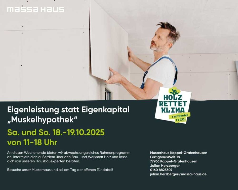 Erleben Sie hautnah, wie Sie mit Eigenleistung bares Geld sparen können! Beim Themenwochenende „Muskelhypothek“ zeigen wir Ihnen, wie Sie durch eigene Arbeit am Hausprojekt Eigenkapital ersetzen können – mit professioneller Unterstützung und praxisnahen Tipps von unseren Hausbauexperten.
