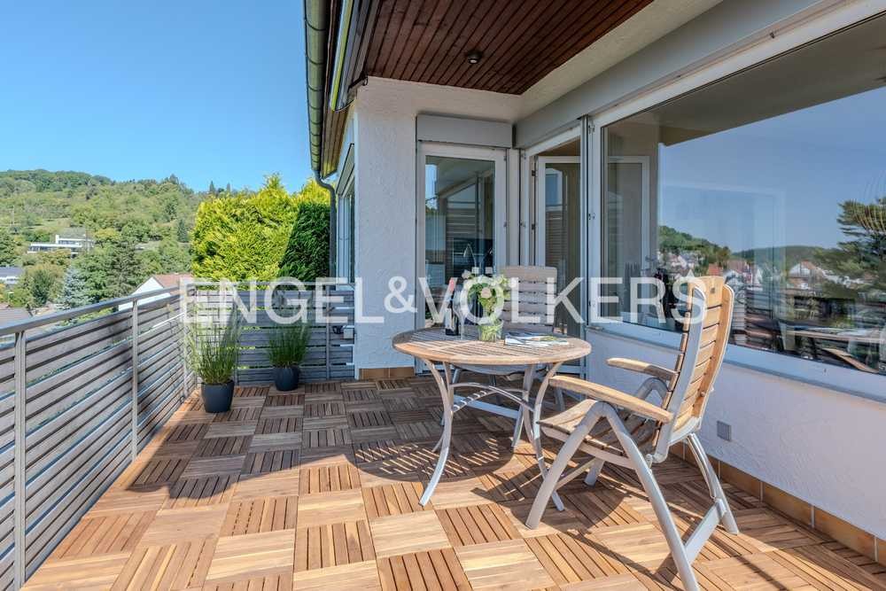 In Esslingen-Wiflingshausen erwartet Sie ein freistehendes Einfamilienhaus mit Einliegerwohnung in gehobener Wohnlage. Das im Jahr 1972 erbaute und 2015 umfangreich renovierte Anwesen steht auf einem ca. 725 m² großen Grundstück und bietet eine Wohnfläche von ca. 206 m² mit weiterer Nutzfläche von ca. 42 m². Die Immobilie gelegen in einer ruhigen Sackgasse vereint gemütliches Wohnen nebst herrlichem Ausblick mit guter Besonnung, gehobene Ausstattung und vielfältigen Nutzungsmöglichkeiten. Bereits im Erdgeschoss zeigt sich der besondere Charakter des Hauses: Der einladende Eingangsbereich mit stilvollen dunklen Fliesen, Gäste-WC und einem praktischen Büro führt in das großzügige, lichtdurchflutete Wohnzimmer. Große Panoramafenster, ein gemütlicher Kamin und Stäbchenparkett schaffen hier eine einzigartige Wohnatmosphäre. Angrenzend befindet sich der Essbereich mit offener Einbauküche incl. Granit-Arbeitsplatten und Markengeräten. Von hier gelangt man direkt auf den weitläufigen Süd-Westbalkon, der mit einem traumhaften Weitblick begeistert.