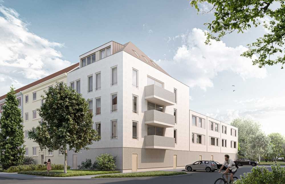 Das Mehrfamilienhaus wir in Massivbauweise ohne Keller errichtet und dem Effizienzhaus-Standard KfW 55 entsprechen. Die Materialität und Farbgestaltung der Fassade wurde in Abstimmung mit dem Denkmalamt gewählt, damit sich der Neubau harmonisch in das Viertel einfügt.