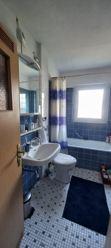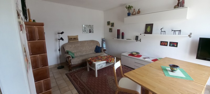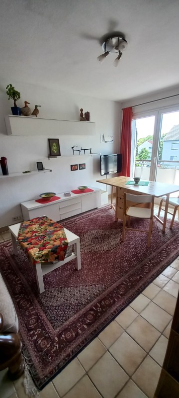 3-Zimmer Etagenwohnung im 2. Stock ohne Aufzug. 45,61 qm, Wohnraum mit angrenzender Einbauküche, Schlafraum, Büro/Schlafraum, Balkon mit elektrischer Markise, TV- und Telefonanschlüsse, Gasetagenheizung. Alle Räume sind mit Fliesen ausgestattet. Badezimmer mit Badewanne und WC, Fenster zum Lüften. Vollausgestattteter Küchenbereich : Kühlschlank mit Gefrierfach, Herd mit 4 Ceran-Kochfeldern und Grill-Backofen.