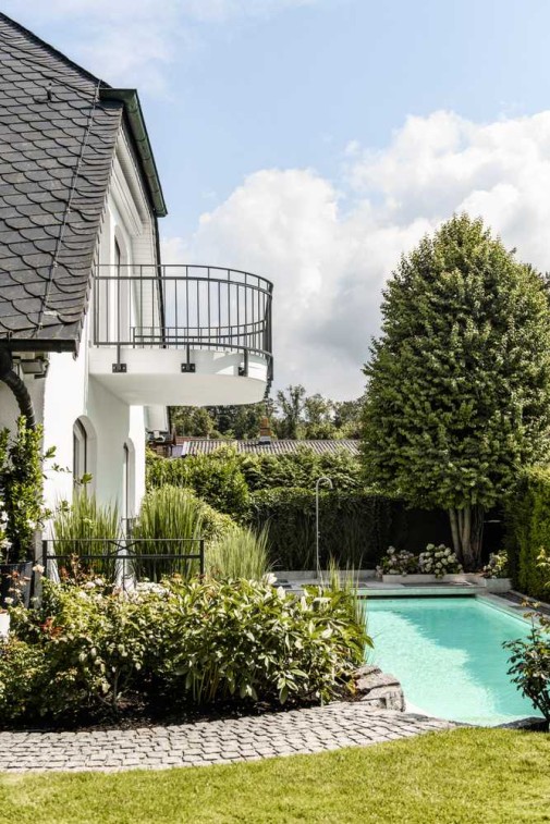 - Professionell gestalteter Garten mit altem Baumbestand, mehreren Terrassen, ruhigen Rückzugsorten, zentralem Outdoor-Pool und skulpturaler Outdoor-Dusche auf 890 m² Grundstück