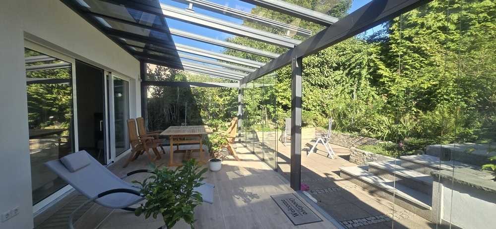 Besondere Highlights sind der helle Wintergarten mit Glasdach, Schiebetüren, LED-Beleuchtung und Markise sowie ein hochwertiger Wellnessbereich: Neben einer Sauna befindet sich hier auch ein Fitnessbereich, der für Entspannung und Ausgleich sorgt. Ein Design-Kaminofen unterstreicht das gemütliche Ambiente.