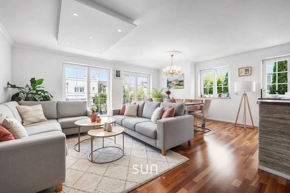 Das Herzstück bildet die großzügige 5-Zimmer-Maisonettewohnung im Erd- und Obergeschoss. Sie bietet rund 136 m² Wohnfläche und den Charakter eines klassischen Einfamilienhauses. Im Erdgeschoss öffnet sich ein heller Wohn- und Essbereich mit bodentiefen Fenstern, stilvollem Kamin und Zugang zur sonnigen Terrasse mit Westausrichtung – ein wunderbarer Ort für Familienessen, Spielnachmittage oder gemütliche Abende am Feuer. Die offene Küche fügt sich harmonisch ein und schafft das kommunikative Zentrum des Hauses.