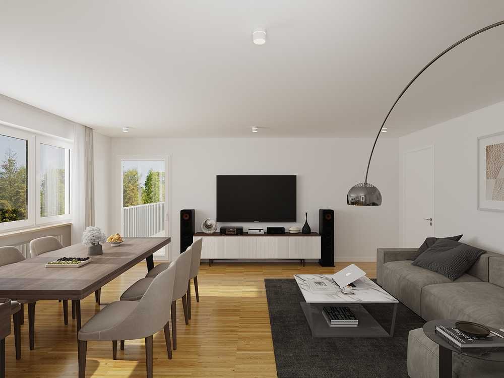 Zum Schutz der Privatsphäre der aktuellen Mieter wurden die Innenaufnahmen dieser Immobilie fotorealistisch visualisiert. Alle festen Bestandteile wie Bodenbeläge, Fenster, Türen, Einbauküche sowie Fliesen und Raumaufteilung entsprechen jedoch exakt dem tatsächlichen Zustand der Wohnung. Lediglich die Möblierung wurde digital angepasst, um einen neutralen und ansprechenden Gesamteindruck zu vermitteln.