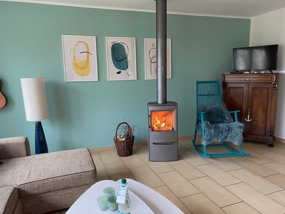 Ruhige, helle Ferienwohnung mit Kamin, 24 qm Terrasse mit Weitblick, großer Spielwiese davor und 500 m zum Wasser mit zwei Badestellen.