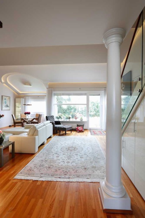 Das großzügige Wohnzimmer verfügt durch die Maisonette-Konstruktion über eine doppelte Raumhöhe.