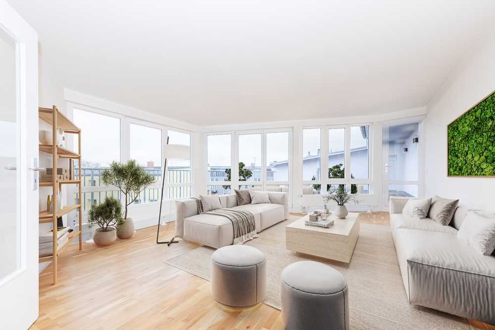 Die 21 m² große Wohnküche bietet genug Platz für Einbauelemente und einen gemütlichen Essbereich. Absolutes Highlight dieses Wohntraums ist das 25 m² große Wohnzimmer mit bodentiefer Fensterfront und Blick auf die wunderbare, riesige Dachterrasse. Hier lässt es sich hervorragend in privater Atmosphäre entspannen. Die Terrasse bietet genügend Platz für einen Outdorr-Essbereich und eine gemütliche Loungearea.