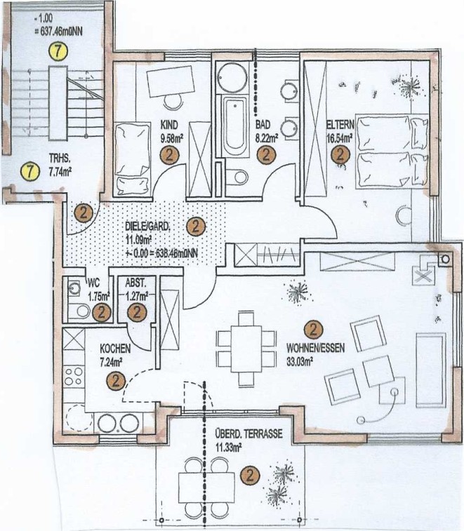 Diese gepflegte 3,5-Zimmer Wohnung mit ca. 90 m² Wohnfläche befindet sich im Halbparterre einer Wohnanlage mit sechs (6) Wohneinheiten in Tuttlingen-Nendingen, direkt an der Donau. Das Baujahr ist 2001 und die Wohnung wurde zuletzt 2022 modernisiert, was für einen sehr guten Zustand spricht. Die Ausstattung ist als anspruchsvoll zu bezeichnen und bietet ein angenehmes Wohnambiente. Zur Einbauküche gehört ein separater Abstellraum. Auf dem Grundriss nicht zu ersehen ist der ca. 10 qm große, beheizte Hobbyraum (für Homeoffice geeignet) im Untergeschoss, mit dem die gesamte Wohnfläche die ausgewiesenen Gesamtwohnfläche 101 qm beträgt.. Ein besonderes Highlight ist die vorhandene Garage mit elektrischem Torantrieb, die Ihnen zur Verfügung steht. Die Wohnung verfügt über ein möblierte Badezimmer mit Dusche, Badewanne, Waschtisch und WC und ist nicht für eine WG geeignet. Zusätzlich ist das separate, zweite WC mit Waschbecken vorhanden. Es gibt einen umfangreichen Hausmeisterservice.