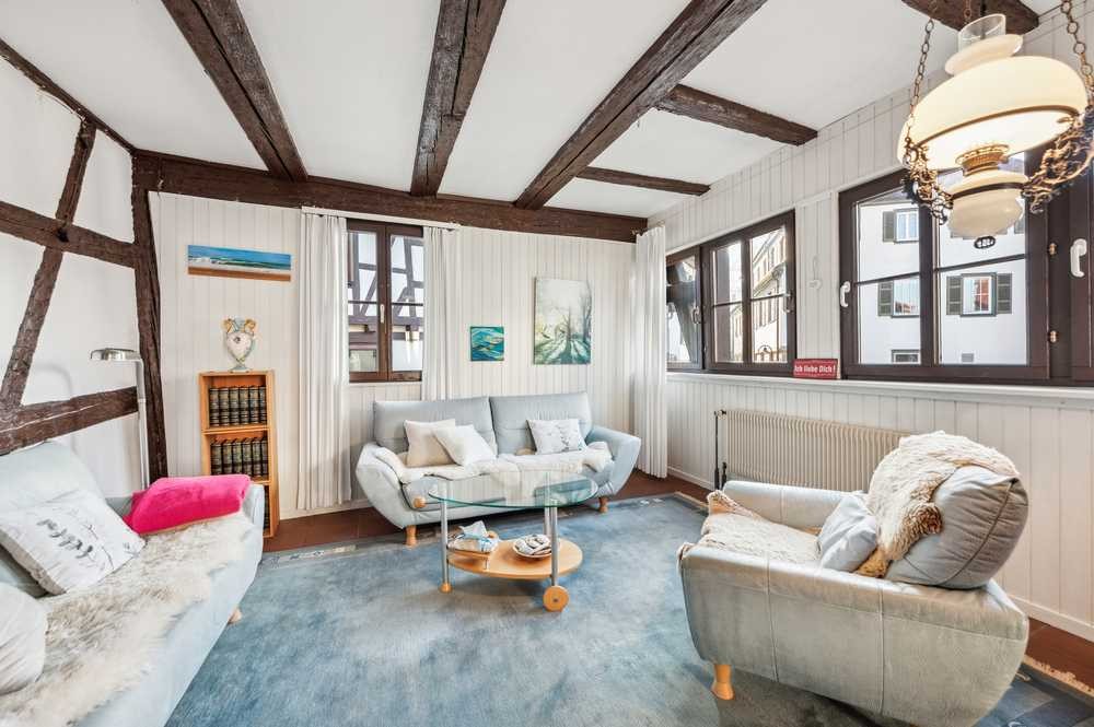 Diese einzigartige Wohnung befindet sich in einem Fachwerkhaus, das im 16. Jahrhundert in massiver Bauweise errichtet wurde und unter Denkmalschutz steht. Mit 71 von 100 Miteigentumsanteilen ähnelt sie einem Einfamilienhaus. Im Jahr 1980 wurde das Haus kernsaniert und befindet sich auf Grund laufend durchgeführter Modernisierungsmaßnahmen in einem gepflegten Zustand. Der Epoche entsprechende Bauelemente wurden dabei erhalten und verleihen der Immobilie einen besonderen Charme. Im Zuge der Maßnahmen wurde die Fassade, die Heizung, das Badezimmer, das Gästezimmer und die Küche modernisiert. In dem Gebäude befindet sich noch eine weitere Wohneinheit mit einem separaten Hauseingang.