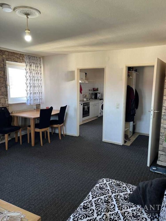 Die Wohnung bietet ein geräumiges Wohnzimmer, von dem aus man in die abgetrennte Küche gelangt. Die Küche verfügt zusätzlich über einen kleinen, separaten Abstellraum - praktisch für Vorräte oder Haushaltsgeräte.