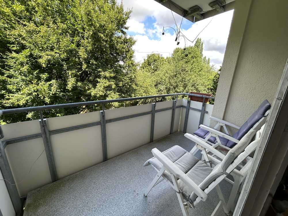 Das Wohnzimmer ist freundlich und hell und bietet Zugang zum Balkon, der sich zur ruhigen Rückseite der Anlage orientiert. Hier genießen Sie einen schönen Blick ins Grüne, der zum Entspannen und Verweilen einlädt.