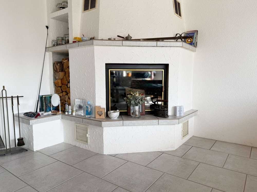 Die Raumaufteilung des Erdgeschosses umfasst ein Wohnzimmer, das aufgrund der großen Fensterflächen das Tageslicht optimal nutzt und einen schönen Ausblick auf die Terrasse und den Garten bietet. Der Wohnbereich ist hell und elegant gestaltet und verfügt über einen Kamin, der zu gemütlichen Stunden im Kreise der Familie oder mit Freunden einlädt.