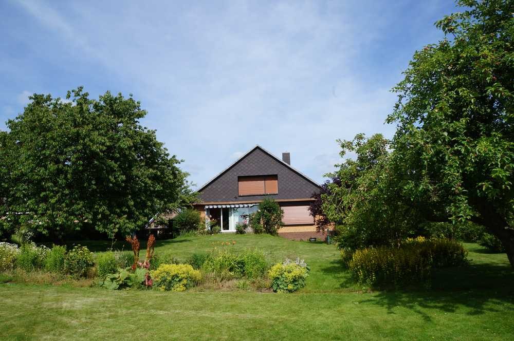 Das große Grundstück bietet einen schön angelegten Garten, den man von der Terrasse überblicken kann.