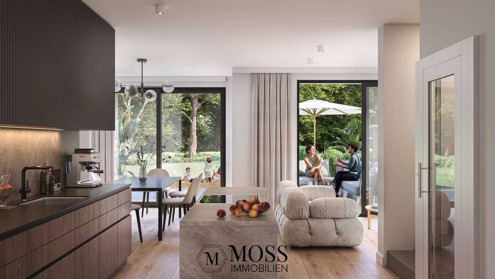 ein Schmuckstück für sich. Eine bodentiefe Dusche erquickt den Körper. Von der Badewanne betrachten Sie die Baumwipfel, die sich sanft im Wind wiegen. Eine transluzente Glaswand trennt das Hauptbad vom großzügigen Masterbedroom, einem Rückzugsort, wo der Geist zu verweilen wünscht. Große Flügeltüren zieren den Balkon und die Gartenterrasse. Es entsteht ein Ruhepol, wo die Grenzen zwischen dem Innen und dem Außen ineinanderfließen. Ein weiteres Badezimmer steht Ihnen mit beeindruckender Dusche im Erdgeschoss zur Verfügung. Der offen gestaltete Wohn- und Essbereich stellt das Herzstück der Wohnung dar. Die Gartenterrasse erweitert hier den Wohnraum unter den freien Himmel und heißt Sie im grünen Paradies Willkommen.
