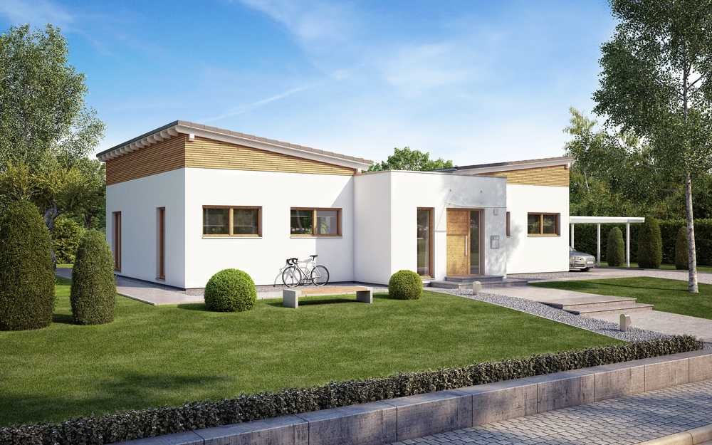 Extravagante Optik bietet das Äußere des Hauses: das sogenannte Schmetterlingsdach mit zwei zueinander geneigten Pultdächern fällt direkt ins Auge. Eine gewisse Leichtigkeit erhält das Haus durch die integrierte Holzfassade im oberen Bereich.