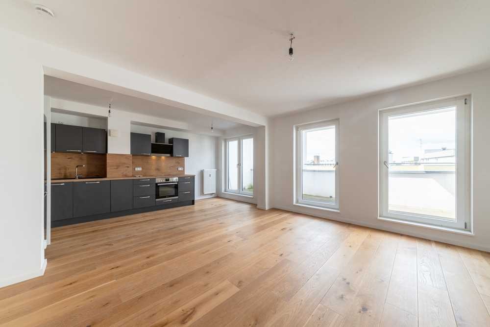 Die offene Wohnküche bietet ausreichend Platz für einen großen Esstisch und geht harmonisch in den Wohnbereich über – perfekt für gesellige Abende oder entspannte Stunden zuhause. Von hier aus betreten Sie die westlich ausgerichtete Loggia, die Ihnen Sonne bis in die Abendstunden bietet.