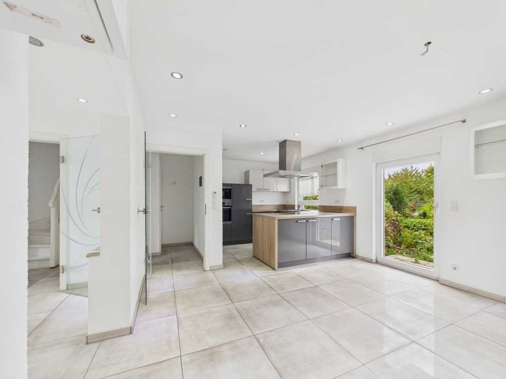 Das Erdgeschoss präsentiert sich offen, einladend und lichtdurchflutet. Der großzügige Wohn- und Essbereich bildet das Herzstück des Hauses und schafft durch die offene Küche ein harmonisches Raumgefühl. Der Essbereich bietet zudem einen direkten Zugang zur Terrasse und zum Garten – perfekt, um den Wohnraum in den wärmeren Monaten ins Freie zu erweitern.