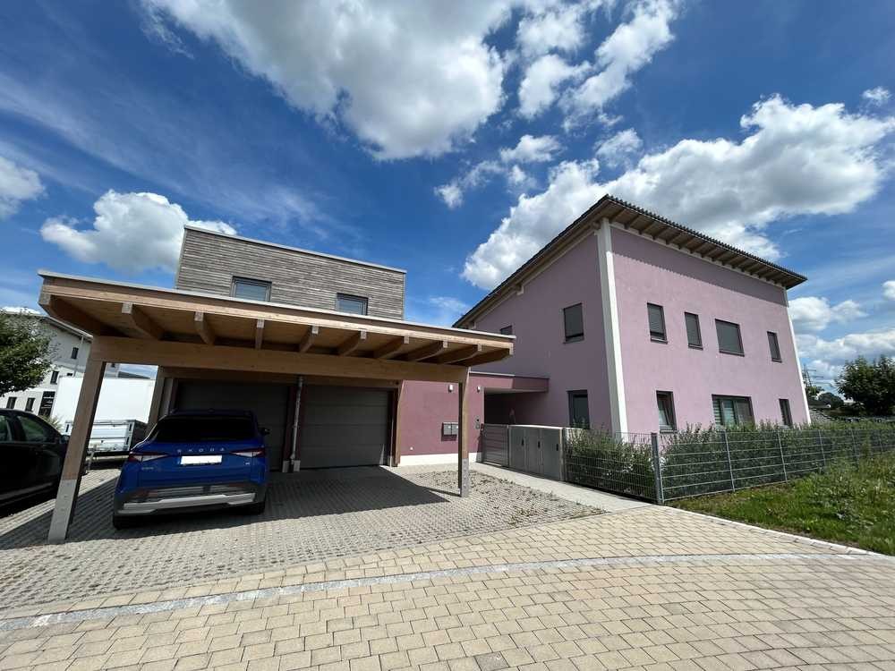 Unmittelbar mit dem Haupthaus ist das Garagen-/Technik- und "Einliegerbürogebäude" durch die Überdachung verbunden. Auf der unteren Etage erwartet Sie eine Doppelgarage mit elektr. Toren und vorgebautem Carport, Wallbox-Anschluss und der Heiz- und Technikraum. Zum Einliegerbüro (ca. 41m² Fläche) führt eine gerade Stahltreppe. Durch eine Diele gelangen Sie direkt in den hellen Büroraum, der mit einer praktischen neuwertigen Küchenzeile keine Wünsche offen lässt. Ein WC mit Duschbad und ein separater Lagerraum sorgen für weiteren Komfort. Die obere Etage ist elegant in Holzfassade gekleidet. Die Innenplissees sorgen für die nötige Verschattung des Raumes und der verlegte Vinyl in Holzoptik gilt als pflegeleicht. Von diesem Büro gelangt man auf die Dachterrasse, welche auch als Ausstellungsfläche genutzt werden kann. Weitere PKW-Stellplätze befinden sich auf dem Grundstück.