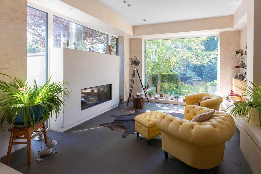Der offene Wohnbereich mit Zugang zur großen Sonnenterrasse und in den traumhaften Garten ist das Herzstück des Hauses. Rechts schließt sich eine stilvolle Bibliothek an, links der gemütliche Kaminbereich mit Übergang zum Esszimmer – ein Ort für genussvolle Stunden.