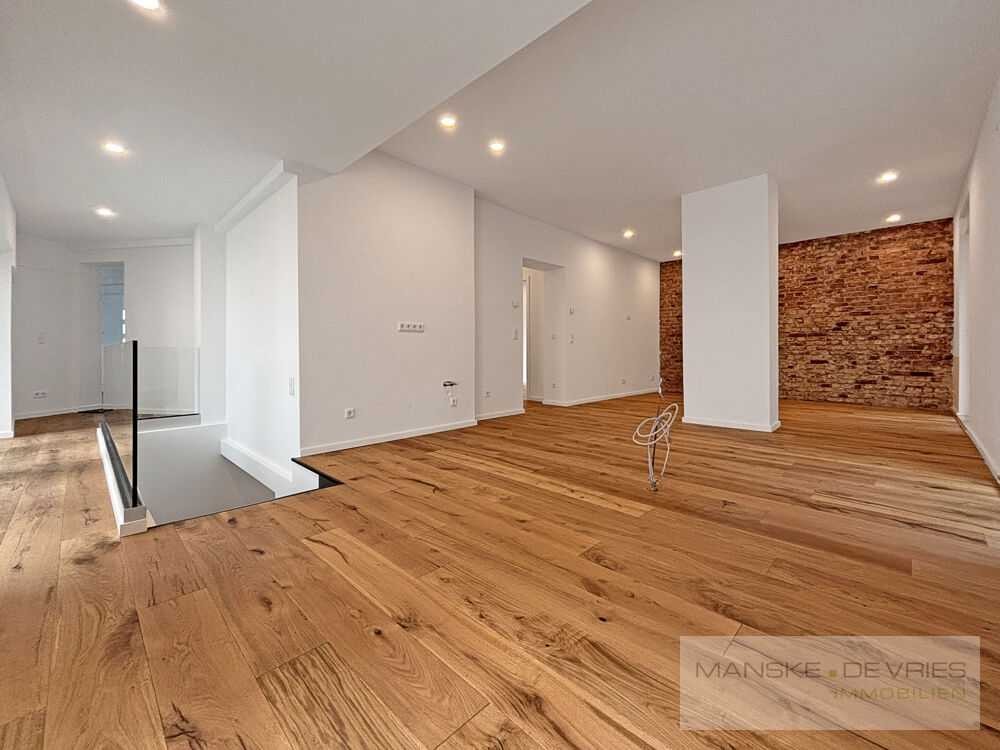 Das Herzstück der Wohnung ist der großzügige Wohn-/Essbereich mit ca. 43 m², bodentiefen Fenstern und einer stilvollen offenen Ziegelsteinwand als architektonisches Highlight.