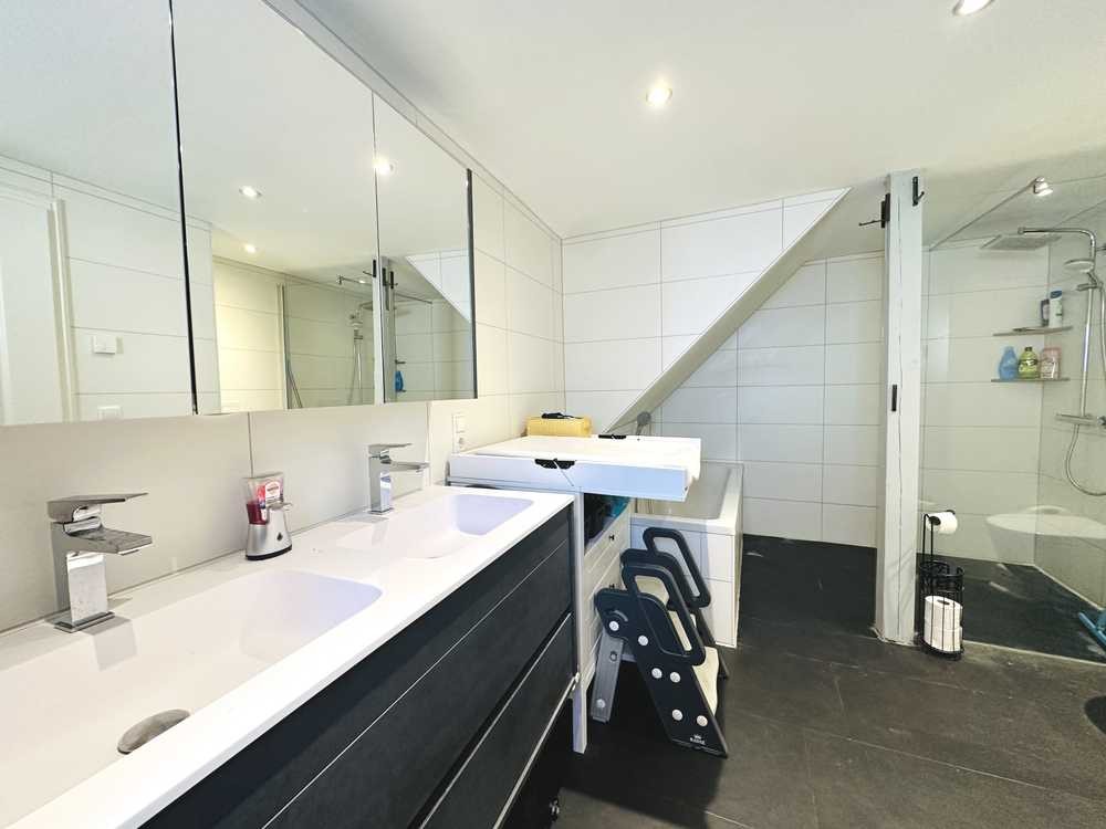 Besonders das Badezimmer mit doppeltem Waschbecken, bodentiefer Dusche und Badewanne ist hervorzuheben.