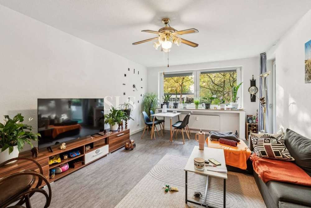 Der lichtdurchflutete Wohn- und Essbereich mit großem Fensterband und Zugang zum überdachten Balkon bildet das Herzstück der Wohnung. Von hier aus eröffnet sich ein freier Blick ins Grüne, der besonders in den Sommermonaten für entspannte Stunden sorgt. Das Schlafzimmer bietet ausreichend Platz für einen großzügigen Schlafbereich, während die modernisierte Küche mit hellen Fliesen und zeitgemäßer Ausstattung den funktionalen Charakter der Wohnung unterstreicht.