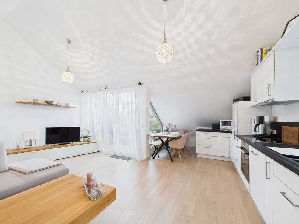 Mit einer Deckenhöhe von bis zu fünf Metern entfaltet die rund 65 Quadratmeter große Wohnung eine beeindruckende Großzügigkeit. Das offene, harmonisch gestaltete Raumkonzept vermittelt ein einzigartig weites und repräsentatives Wohngefühl. Das große Wohn-Esszimmer mit offener Küche ist der Mittelpunkt der Wohnung. Hier gibt es genügend Platz für einen Esstisch, eine moderne Küchenzeile und ein großes Sofa. An einem hellen Fensterplatz lässt sich ideal ein kleiner Arbeitsplatz einrichten – perfekt für das Homeoffice. Hohe Decken und helle Parkettböden schaffen eine freundliche, luftige Atmosphäre. Die stilvolle Einbauküche ist mit Siemens-Elektrogeräten ausgestattet und fügt sich harmonisch in das moderne Gesamtbild ein. Die kleine, charmante Dachterrasse liegt nach Westen und ist von den Seiten geschützt, wodurch sie eine ruhige und private Atmosphäre bietet – ein wunderbarer Ort, um abends die herrlichen Sonnenuntergänge und den Blick ins Grüne zu genießen.