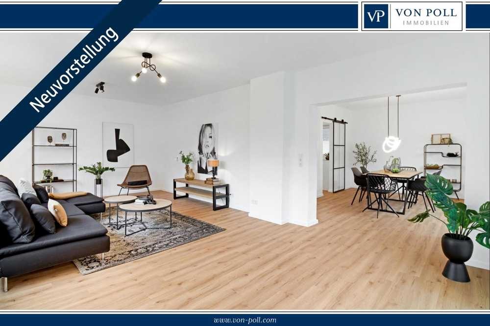 Aus der Diele heraus, führt der Weg in den offenen Wohn- und Essbereich mit großen Fenstern, die viel Tageslicht hereinlassen und einen direkten Zugang zur Terrasse und dem gepflegten Garten ermöglichen.