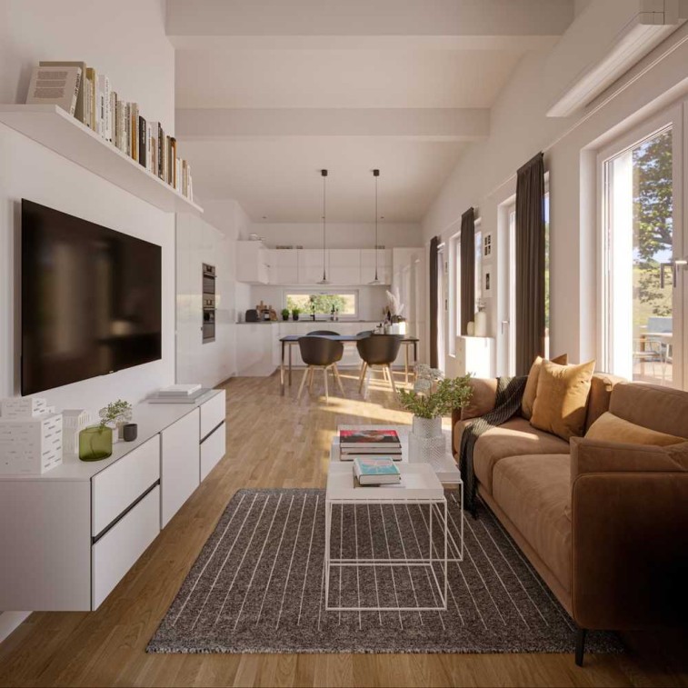 Die Ausstattung des COMPACT 87 lässt keine Wünsche offen. Genießen Sie eine großzügige Terrasse, die Ihnen die Möglichkeit bietet, die warmen Sonnenstrahlen und die frische Luft zu genießen. Die lichtdurchfluteten Räume sorgen für ein angenehmes Wohnklima, während durchdachte Komfortdetails wie Abstellräume und optimale Stauraumlösungen den Alltag erleichtern. Hier finden Sie den perfekten Rückzugsort, der sowohl für gesellige Stunden mit Freunden als auch für entspannende Momente im eigenen Heim geeignet ist.