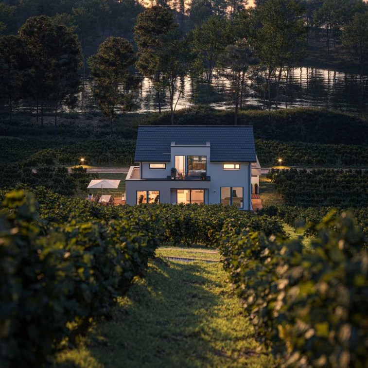Das Haus ist auf einem realen Baugrundstück geplant oder auf einem Grundstück in einer Planungsphase. Die Bilder zeigen ggf. Extras, die im Rahmen des Bebauungsplans noch geprüft werden müssen.