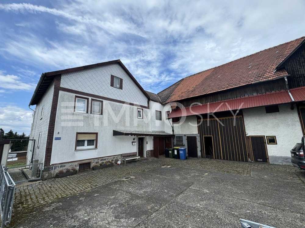 Das Anwesen liegt auf einem ca. 2000 qm großen Grundstück (inkl. 500 qm Garten) und umfasst ein Wohnhaus mit ca. 260 qm Wohnfläche, das in mehreren Umbauten erweitert wurde (u.a. 1932, 1965, 1980, 1984 und 2000). Zudem gibt es zwei Scheunen, eine ca. 100 qm große Maschinenhalle, eine ältere Halle sowie eine ca. 30 qm große Garage – teils renovierungsbedürftig. Abgerundet wird das Angebot durch drei Kellerräume und einen Carport.