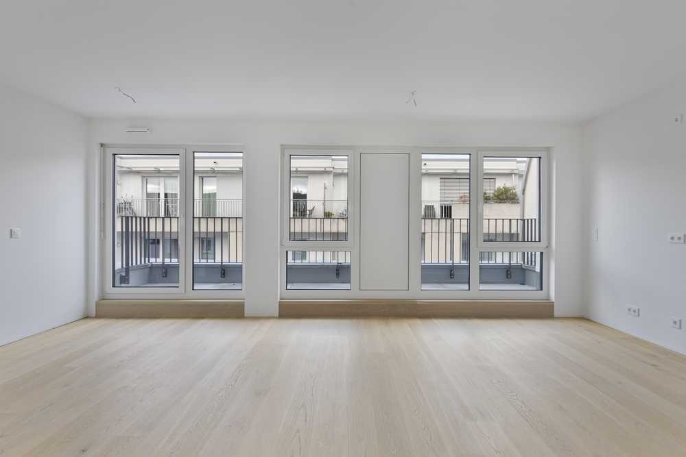 Der Wohn-Essbereich mit offener Küche ist großzügig geschnitten und wird durch bodentiefe Fensterflächen mit Tageslicht durchflutet. Das Schlafzimmer liegt zur ruhigen Rückseite des Hauses und bietet direkten Zugang zur Dachterrasse – ideal für den ersten Kaffee am Morgen unter freiem Himmel.