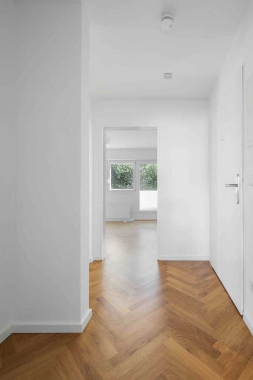 Ein neues Designer-Bad mit Walk-In-Dusche und großformatigem Natursteinbelag, eine separate Küche mit Fenster, eine großzügige Diele mit Abstellbereich und der stilvolle Fischgrätparkettboden runden das schöne Ambiente ab.