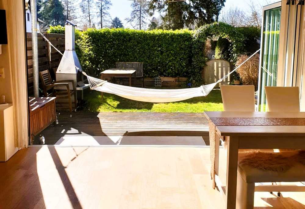 Auf zwei Ebenen bietet die modern ausgestattete Wohnung ein durchdachtes Raumkonzept. Der große Wohn-/Essbereich mit offener Küche im Erdgeschoß schafft ein großzügiges Raumgefühl in gemütlicher Atmosphäre. Große Falttüren lassen sich komplett zur ebenerdigen Terrasse hin öffnen. Und mit Blick auf den eigenen idyllischen Garten in Süd-/Westausrichtung können Sie die Sonne entspannt bis in die Abendstunden genießen.