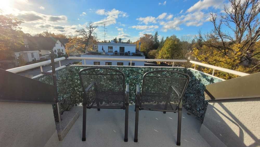Durch die hohen Räume im oberen Stockwerk hat man ein phantastisches Raumgefühl, der Balkon ist im Dach eingebettet, quasi eine kleine Dachterrasse - und bietet einen Blick über die Dächer ins Grüne. Balkon und Loggia sind nach Westen ausgerichtet.
