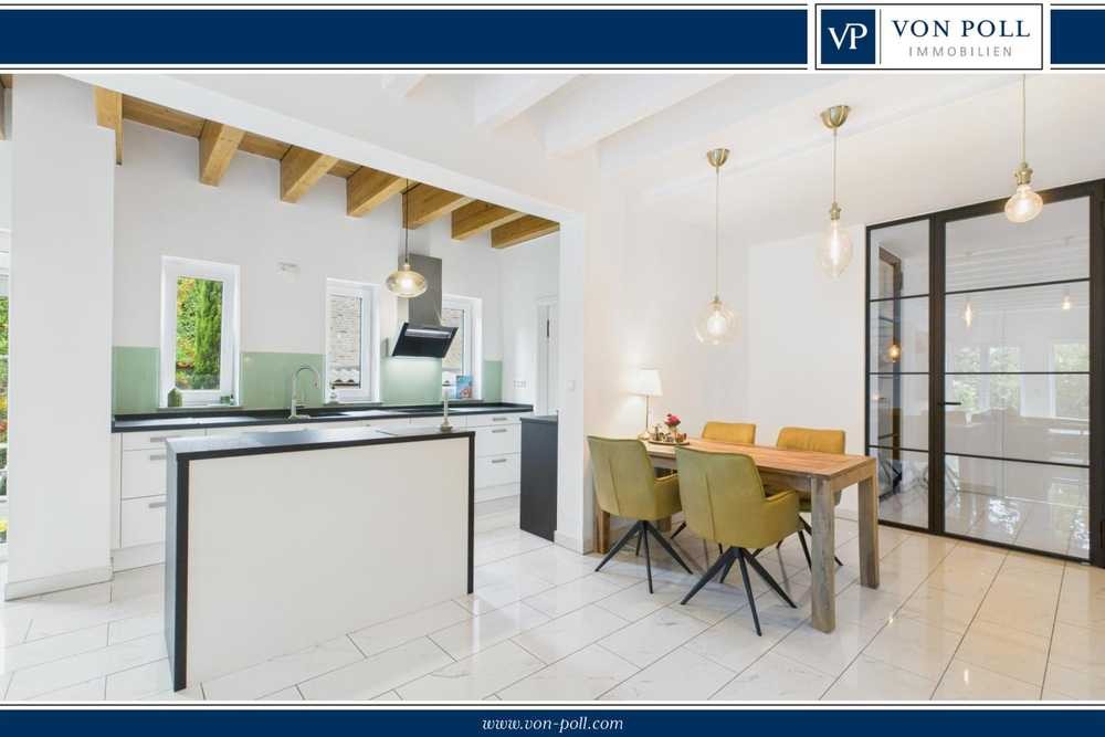 Bereits beim Betreten wird die gelungene Verbindung aus zeitgemäßem Wohnkomfort und moderner Technik spürbar. Die Außenwände des Hauses sind gedämmt, die im Jahr 2021 erneuerte Haustür sowie die ebenfalls 2021 eingebauten Kunststofffenster mit dreifacher Verglasung sorgen für ein hohes Maß an Energieeffizienz und Sicherheit. Ergänzt wird dies durch elektrische Rollläden mit Somfy-Steuerung und einen Einbruchschutz nach WK 3 Standard. Im Erdgeschoss verleihen stilvolle Lofttüren aus dem Jahr 2022 dem großzügigen Wohn-, Ess- und Kochbereich eine moderne und offene Atmosphäre. Hier bildet ein Kamin den gemütlichen Mittelpunkt, während die offene Raumgestaltung fließend in die hochwertig ausgestattete Küche übergeht, die erst 2023 teilerneuert und erweitert wurde und höchsten Ansprüchen gerecht wird. Ergänzt wird sie durch eine separate Vorbereitungsküche, die als raffinierte Erweiterung dient – ideal, um stilvolle Menüs vorzubereiten und zugleich den repräsentativen Charakter des offenen Wohnbereichs zu bewahren. Dieser Bereich dient ebenfalls als Hauswirtschaftsraum und verfügt über einen Waschmaschinenanschluss sowie ausreichend Platz für einen Trockner.