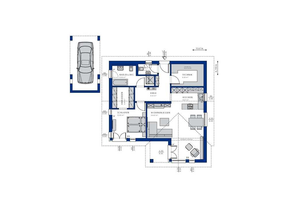 Durch die kompakten Außenmaße passt sich dieser Bungalow jedem Grundstück perfekt an.