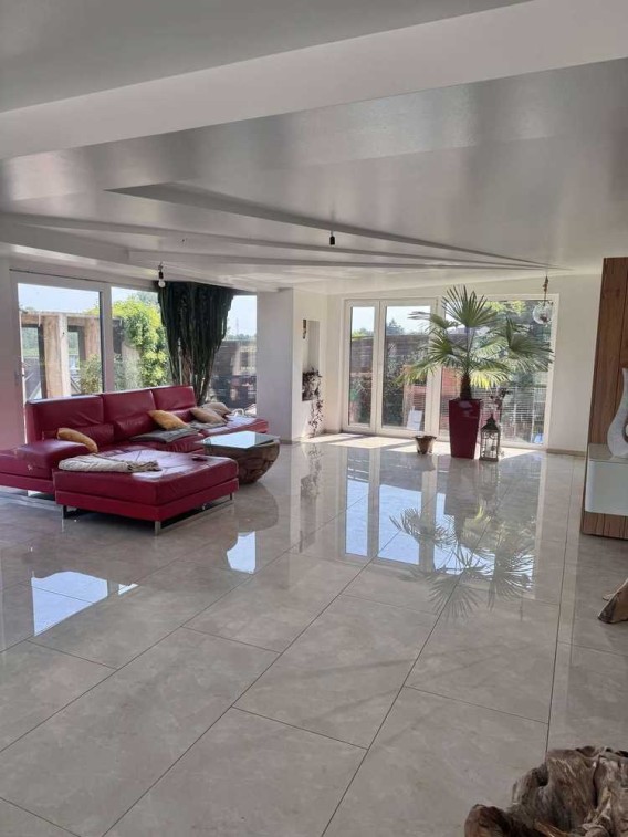 Das Herzstück des Hauses bildet der beeindruckende Wohn- und Essbereich mit offener Gestaltung und einer exklusiven Einbauküche (Baujahr 2015), der durch seine Großzügigkeit und Helligkeit begeistert. Zahlreiche Fensterfronten sorgen für ein angenehmes Wohngefühl und ermöglichen den direkten Zugang zur sonnigen Terrasse – ideal für gesellige Abende oder entspannte Stunden im Freien. Die Bodenbeläge im gesamten Haus bestehen aus hochwertigen Fliesen, wobei der Terrassenbelag noch individuell gestaltet werden kann.