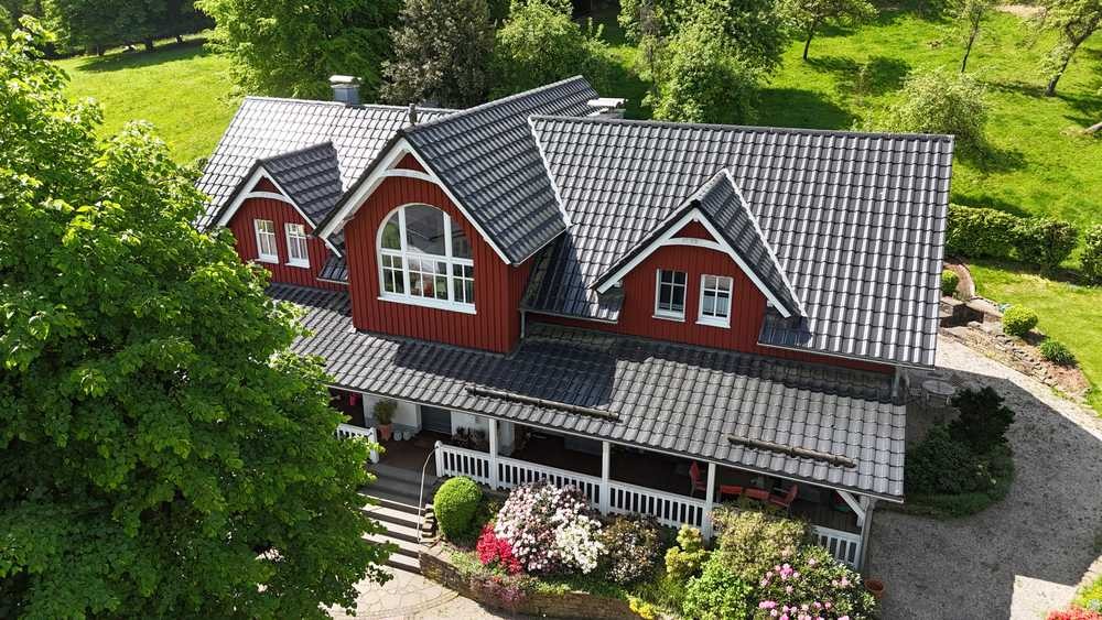 Zum Kauf wird hier eine skandinavische Villa in ländlicher Lage im oberbergischen Kreis angeboten. Das stilvolle Bauwerk fügt sich hervorragend in die Grünflächen ein und liegt im hinteren Drittel des 2.508 m² großen Grundstücks.