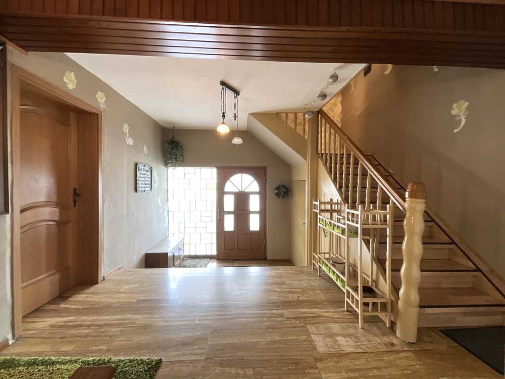 Das Wohnhaus verfügt über drei Etagen, wobei das Dachgeschoss noch nicht ausgebaut ist und somit zusätzliches Potenzial für weiteren Wohnraum bietet. Im Erdgeschoss befinden sich ein gemütliches Wohnzimmer, ein Schlafzimmer sowie eine Einbauküche mit Zugang zum Garten. Das Obergeschoss umfasst drei Schlafzimmer, ein Badezimmer und eine weitere Küche. Von hier aus gelangt man auf die überdachte Terrasse mit einer Fläche von rund 48 m², die zum Verweilen und Genießen einlädt. Das Dachgeschoss bietet Ausbaureserve, um den Wohnraum individuell zu erweitern.
