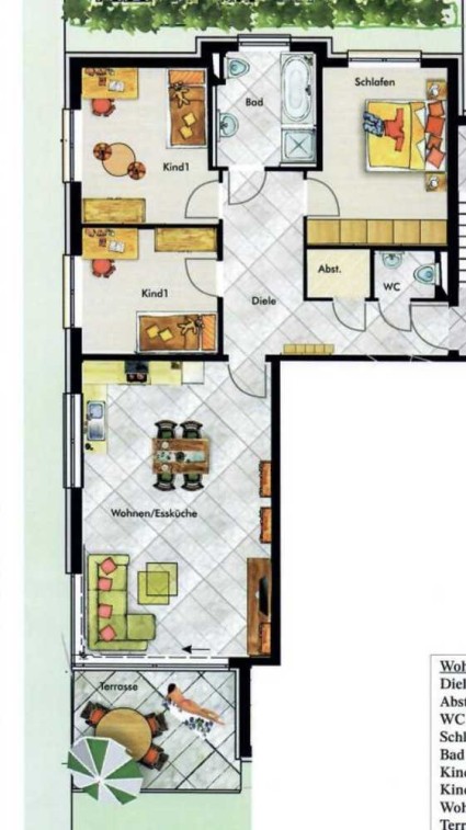 • Wohn- & Essbereich: Großzügiger, offener oder halboffener Schnitt – das Herz der Wohnung mit direktem Zugang zur Terrasse und zum Garten.