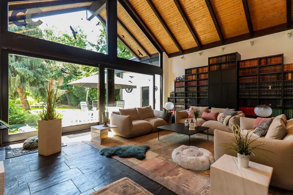 Die Küche, ebenfalls der Marke Poggenpohl ist recht zentral im Erdgeschoss platziert und führt einerseits in einen architektonisch besonderen Anbau: das Wohnzimmer. Hier beeindruckt eine imposante Fensterfront mit Panoramablick in den Garten. Die offene Dachgestaltung verleiht dem Raum ein außergewöhnliches Volumen und schafft ein einzigartiges Wohngefühl. Ein stilvoller Kamin sowie edle Natur-Schieferböden unterstreichen den hochwertigen Charakter. Ein weiteres Detail, das den wertigen Charakter des Hauses unterstreicht, sind die edlen Fensterbänke: Außen mit hochwertigem Schiefer versehen und innen mit fein gearbeitetem Marmor ausgestattet.