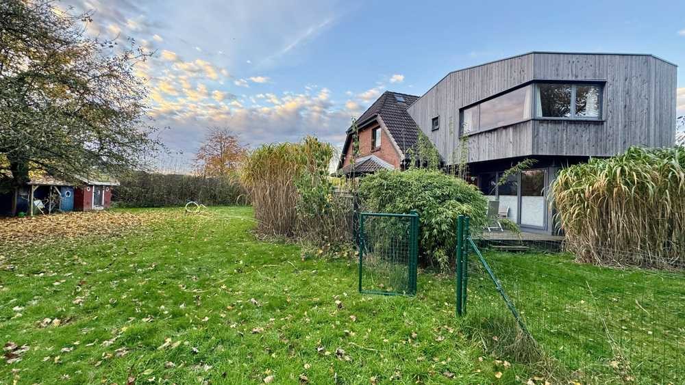 Besonders prägend ist der hochwertige, moderne Anbau von 2006 mit großzügigen Fensterflächen und besonderer Materialwirkung. Im Erd- und Dachgeschoss entstand dadurch ein außergewöhnlich heller und offener Wohnbereich.
