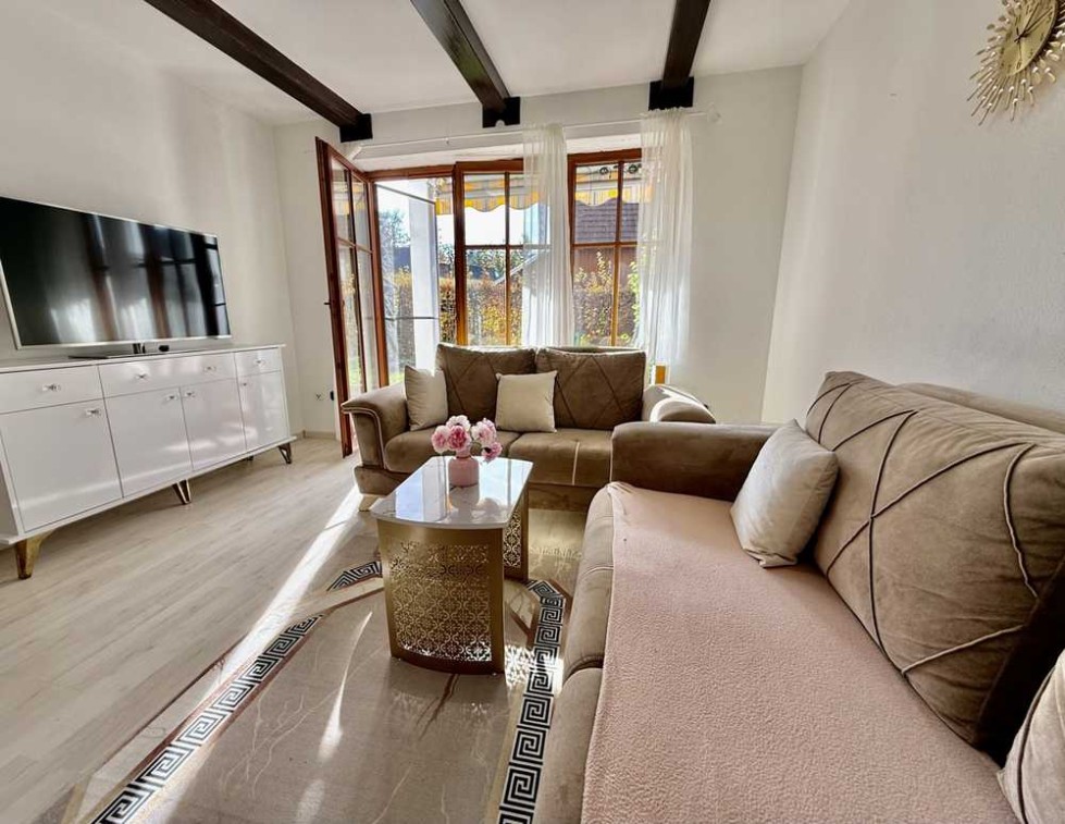 Der helle Wohn- und Essbereich mit Panoramafenster öffnet sich zur sonnigen Südterrasse mit eigenem Gartenanteil – ideal zum Entspannen.